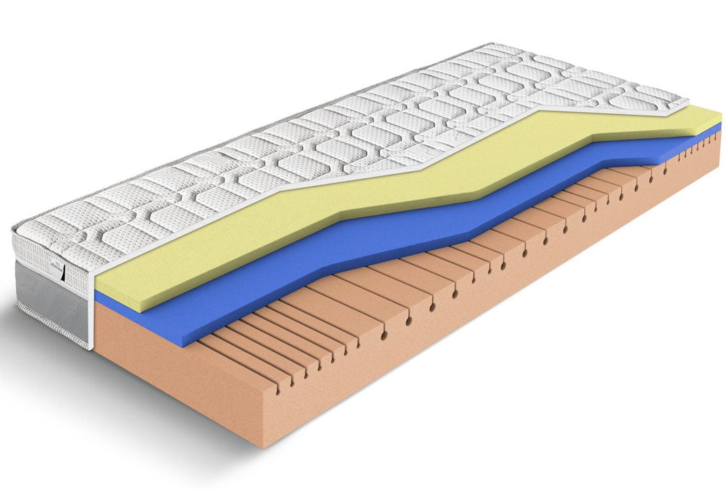 13 cm koldskum i midten med 7 zoner – koldskum er elastik, trykfordeler godt og trørre hurtigt samt har en lang levetid.